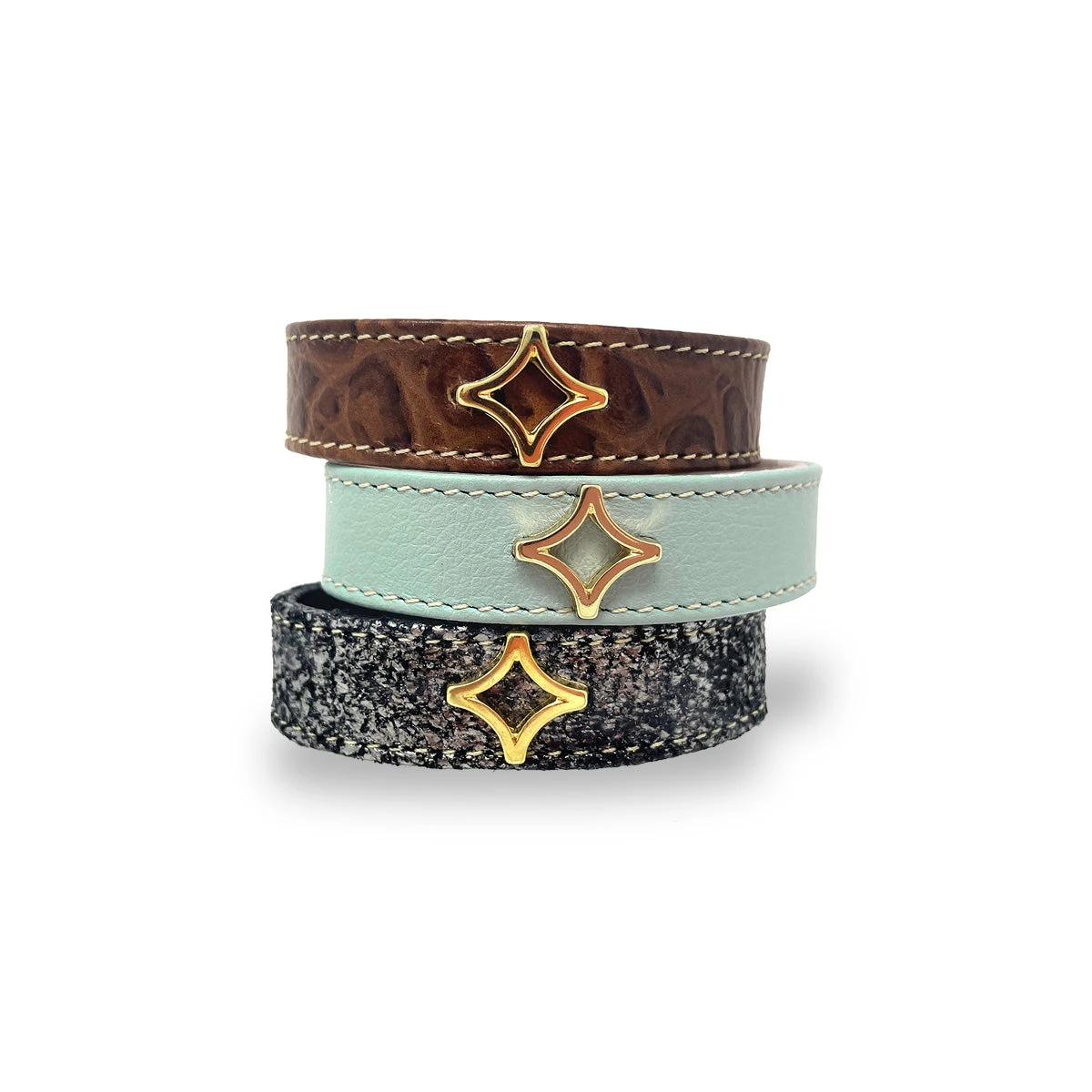 Un detalle icónico y especial, nuestra nueva pulsera hecha 100% en piel con un herraje de nuestro monograma de diamante y herraje bañado en oro de 10k. Creada en combinaciones de pieles de nuestra colección actual.