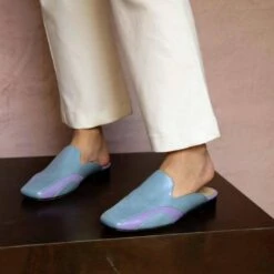 CECY – Charol Azul Y Lila Regina Romero Zapato Flat Mule De Piso Para Dama En Piel