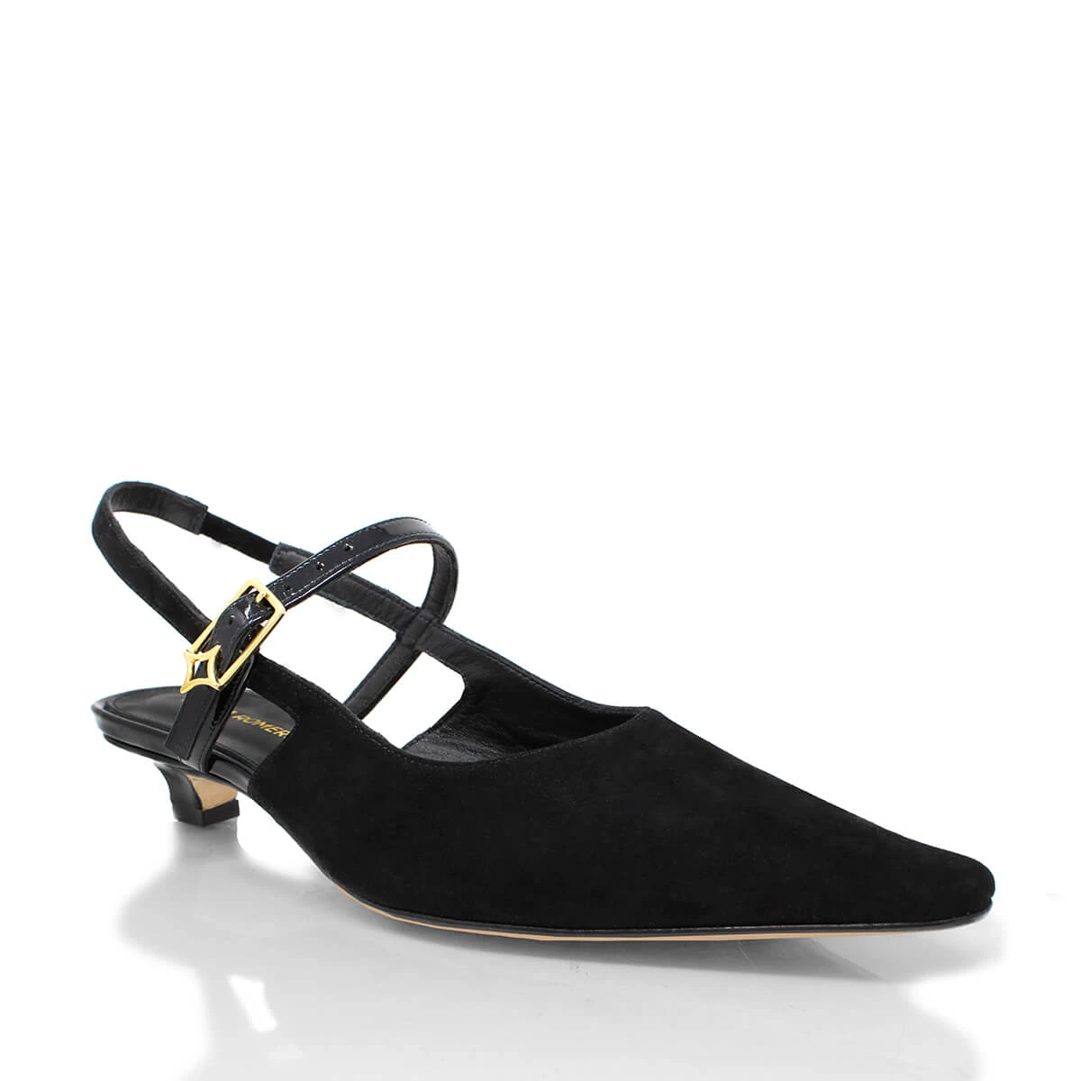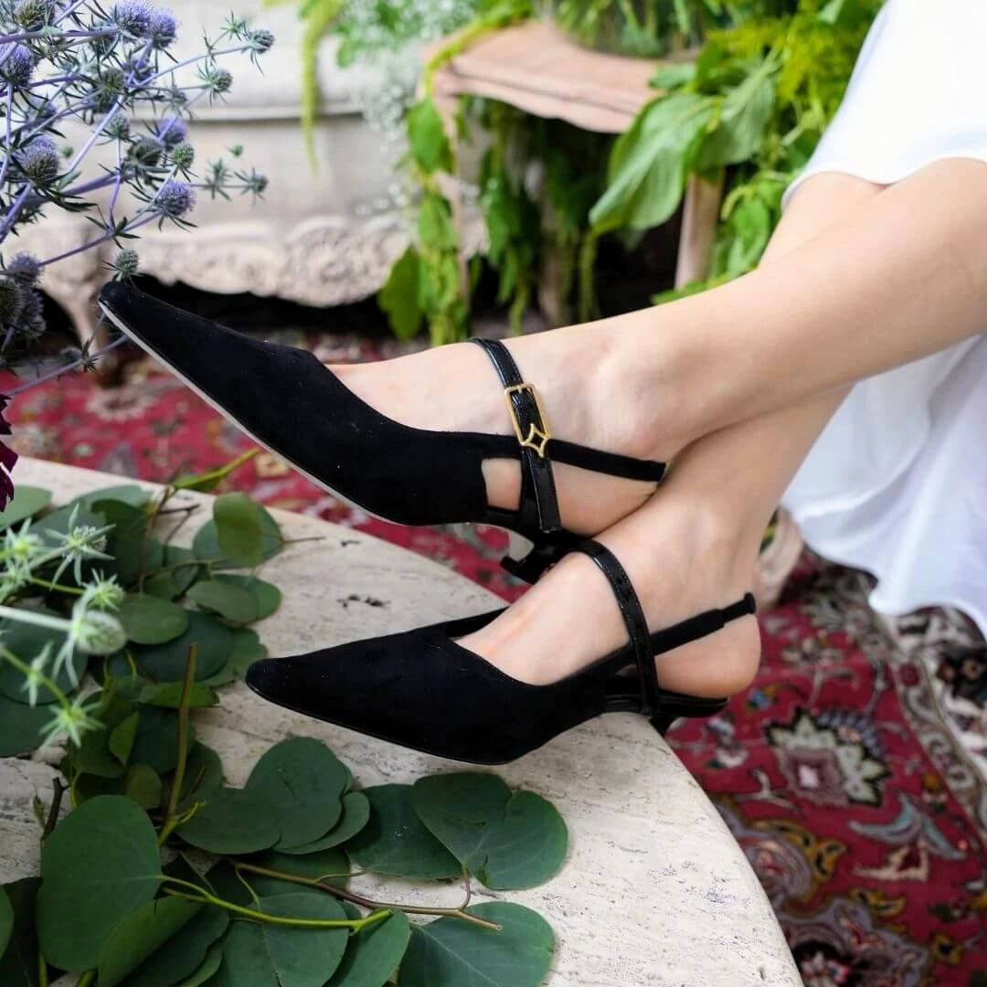 Vanina es una zapatilla que combina ligereza y distinción en una silueta destalonada, realzada por una correa fina que asegura el pie con discreción. La armonía entre el brillo pulido del charol y la textura suave del ante —o de la piel mate— aporta profundidad visual y un carácter refinado, sin excesos.